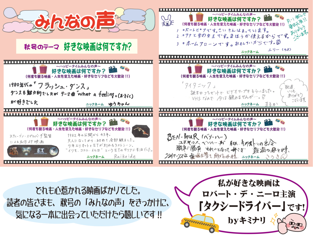 年4回発行するハッピータイム紅葉号では「毎日かかさずにやっていることはなんですか?」をテーマに募集いたしました。たくさんのご応募ありがとうございました!!集まったみんなの声はすべてこちらに掲載いたしました^^ぜひご覧ください♪