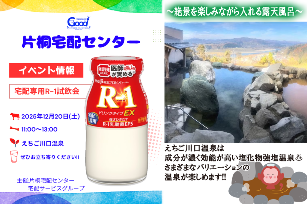 イベント情報 2025年12月17日 最終更新日時 : 2025年12月17日 katagiri-takuhai ♨試飲会のお知らせ♨ 日時:12/20(土)11:00〜13:00場所:えちご川口温泉内容:試飲会 今の時期に強い味方、「宅配専用R-1」をメインに試飲できます! えちご川口温泉は、成分が濃く効能が高い塩化物強塩温泉♨さまざまなバリエーションの温泉が楽しめます。 しっかり温まったあとは、ぜひ片桐宅配センター イベントブースへ♪宅配専用R-1をゴクッとどうぞ! 乳酸菌による腸内環境の改善も期待でき、体を冷やしすぎずにリフレッシュできます(^O^)